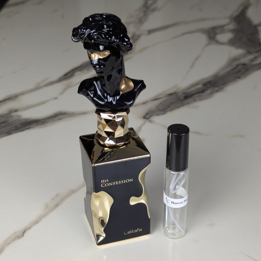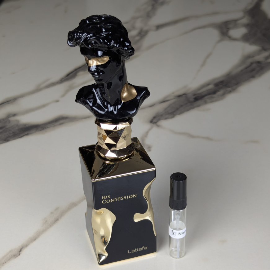 His Confession by Lattafa Perfumes is a Oriental Woody fragrance for men. This is a new fragrance. His Confession was launched in 2024. Top notes are Cinnamon, Lavender and Mandarin; middle notes are Iris, Benzoin, Cypress and Mahonial; base notes are Vanilla, Tonka, Amber, Incense, Cedarwood and Patchouli.