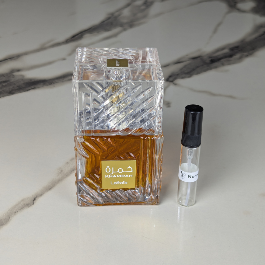 Khamrah by Lattafa Perfumes is a Oriental Spicy fragrance for women and men. Khamrah was launched in 2022. Top notes are Cinnamon, Nutmeg and Bergamot; middle notes are Dates, Praline, Tuberose and Mahonial; base notes are Vanilla, Tonka Bean, Amberwood, Myrrh, Benzoin and Akigalawood.