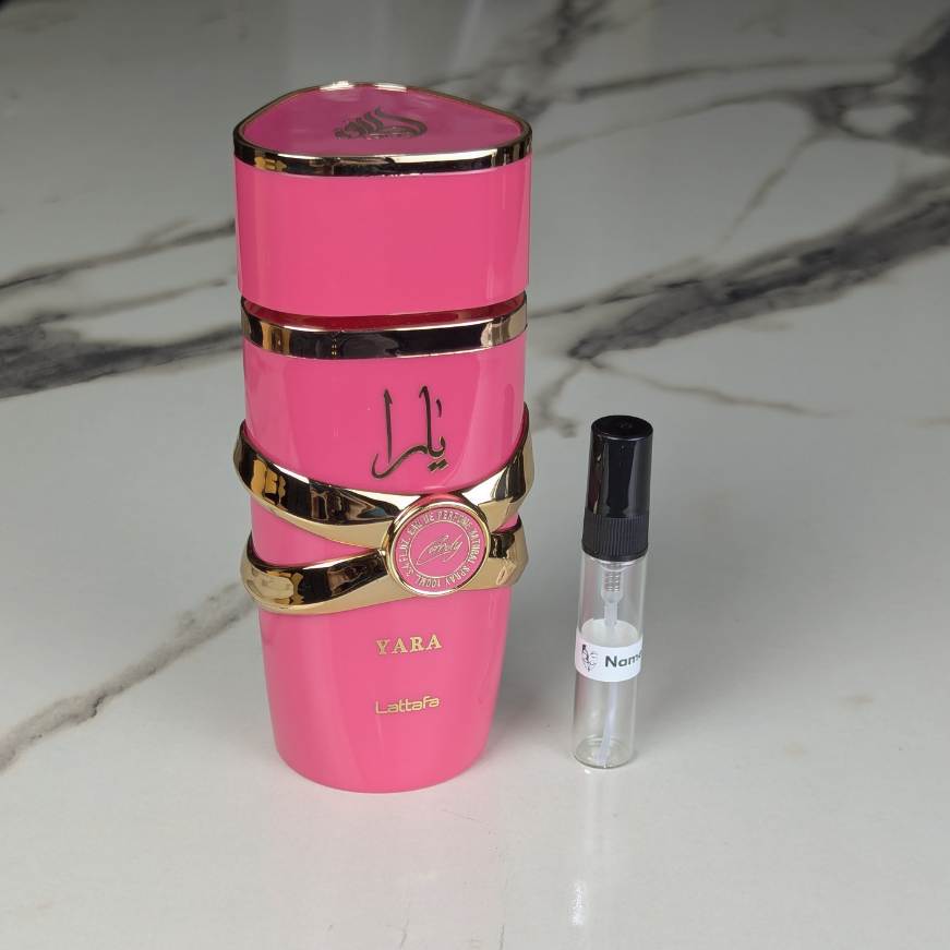 Yara Candy by Lattafa Perfumes is a Floral Fruity Gourmand fragrance for women. This is a new fragrance. Yara Candy was launched in 2024. Top notes are Black Currant and Green Tangerine; middle notes are Strawberry Fizz Candy and Gardenia; base notes are Vanilla, Musk, Amber and Sandalwood.
